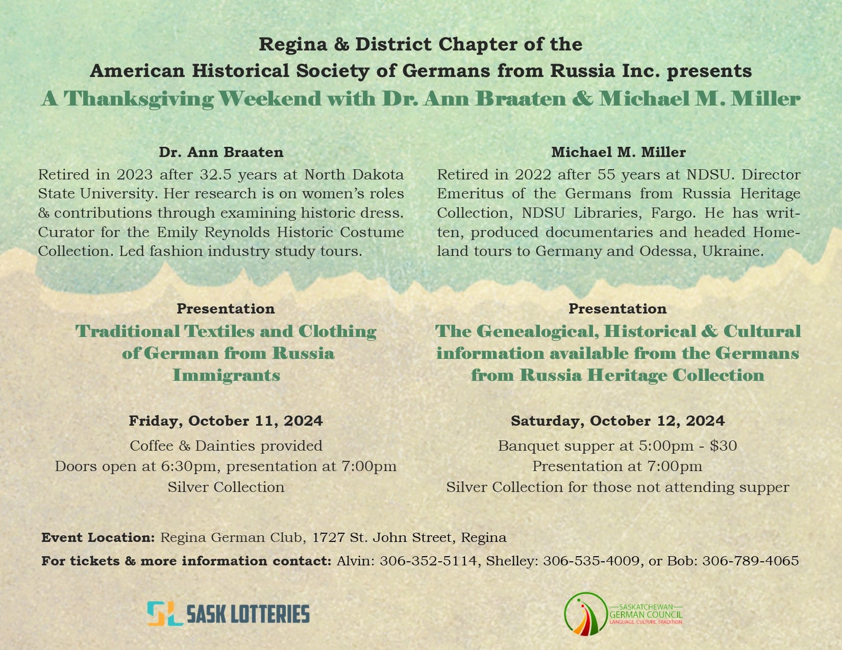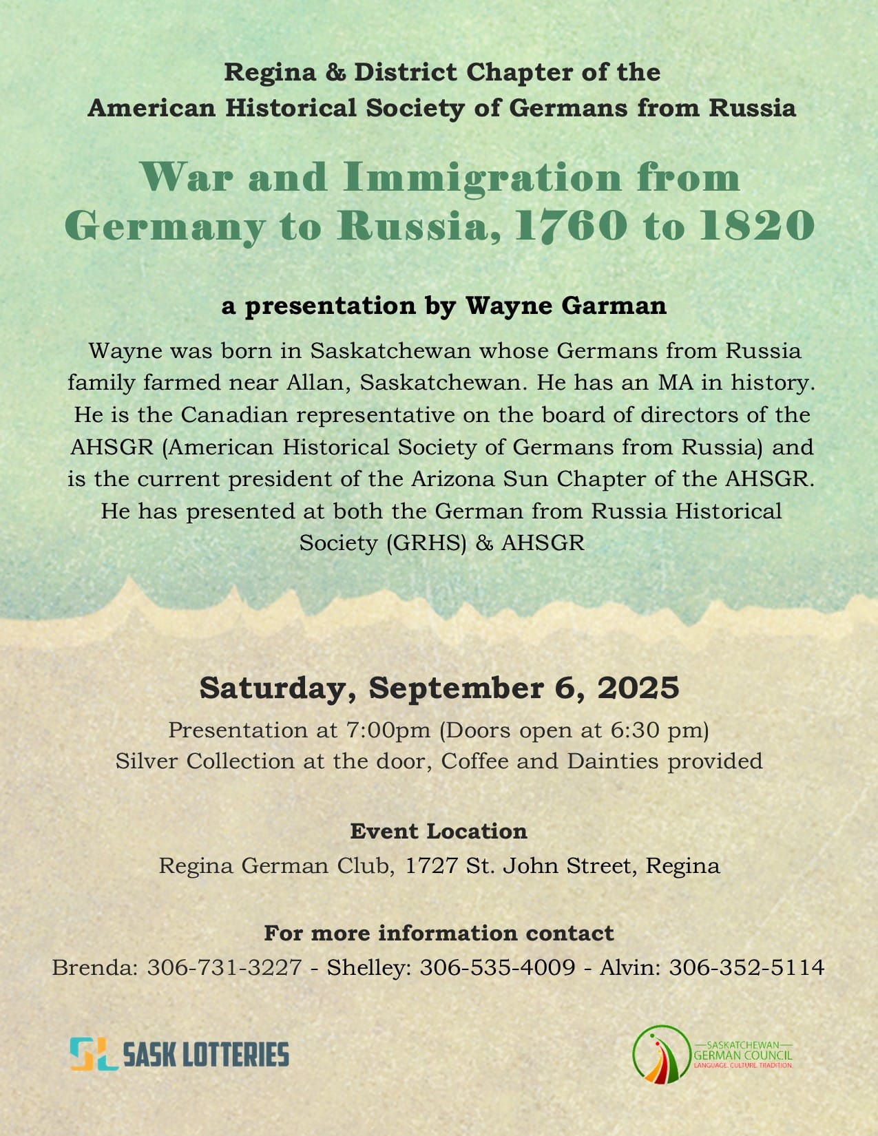 September 6, 2025 presentation by Wayne Garman: War and German Immigration to Russia – 1760 – 1820. Attached is the event poster and a picture of the event at the Regina German Club.