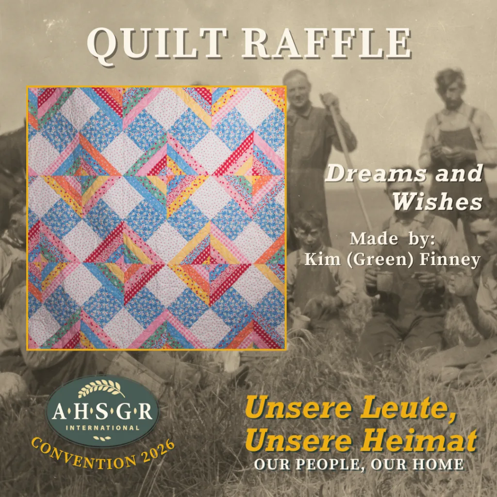 “Dreams and Wishes” is an appropriate pattern name for the quilt that I made as a donation to the 2026 AHSGR Convention. The donation is dedicated to my maternal great grandparents, Friedrich and Maria Reinhardt Schwartzkopf who courageously migrated to America in 1875. Friedrich and Maria were from the village of Donhof, Saratov, Russia. They settled and homestead near Bison (Rush County) Kansas. In researching the family history, I have discovered that they were also sponsors to other family members who chose to emigrate and make better lives for themselves. Friedrich and Maria became parents to 14 children. All of their children were educated and became respected citizens in the Rush County, Kansas area. Our Germans from Russia ancestors were an inspiration for all of us that follow.”