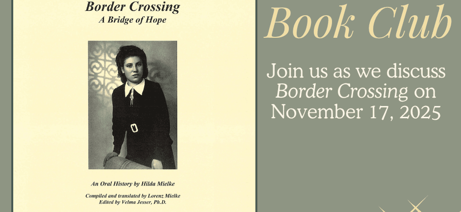 This quarter, our Book Club selection is Border Crossing, A Bridge of Hope by Hilda Mielke. Hilda tells her family’s story of life in Rogowka, Ukraine during the 1930’s, their experiences during the World War II years, and finally their emigration to North America. It’s a short but important memoir that may be similar to your family’s story. As always, Sheri Rohn Ertl will tell the stories behind the story.