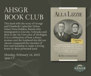Join us for Book Club on February 24th at 2pm CT. This book tells the story of George and Elisabeth Catherine Debus Maser from Kukkus, Russia who immigrated to Lincoln, Nebraska and then to the Au Gres area of Michigan. It is a celebration of how a brave woman and the husband she did not … Continued
