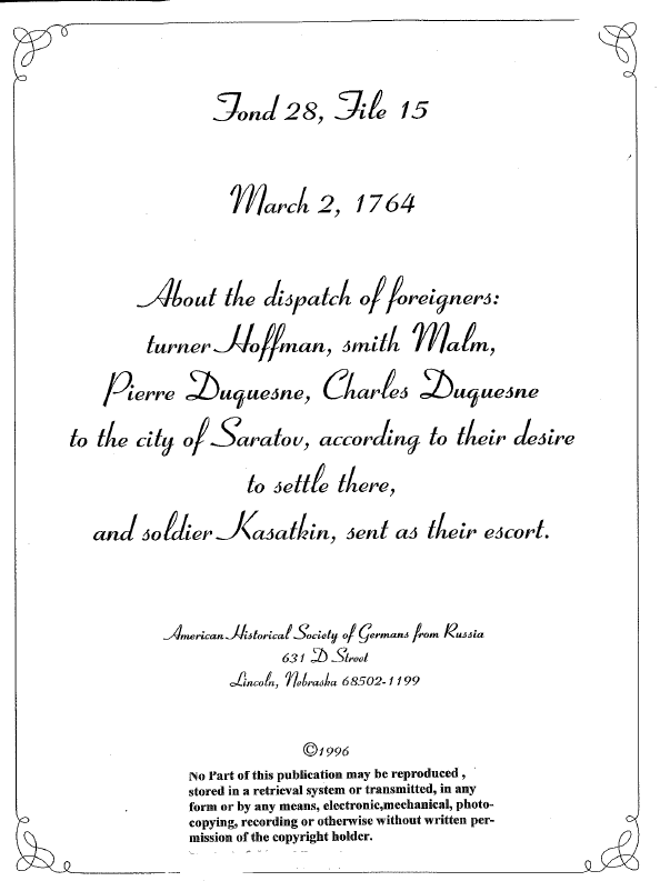 About the dispatch of foreigners: turner (carpenter) Hoffman, smith (blacksmith) Malm, Pierre Duquesne, Charles Duquesne to the city of Saratov according to their desire to settle there, and soldier Kasatkin, sent as their escort.
