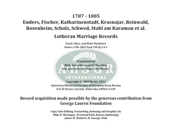 Enders, Fischer, Katharinenstadt, Krasnajar, Reinwald, Rosenheim, Schulz, Schwed, Stahl am Karaman et al. Lutheran Marriage Records 1787 – 1805