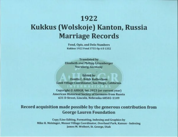 Kukkus (Wolskoje) Kanton, Russia Marriage Records 1922
