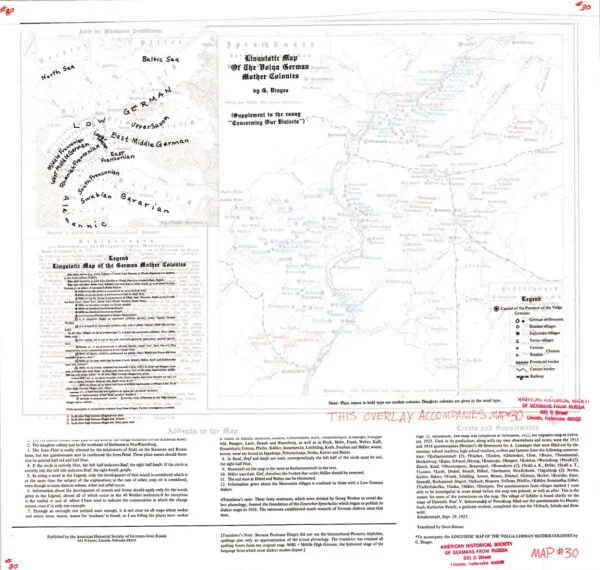 A reprint of a 1923 map by Georg Dinges of Saratov University. An elaborate, color-coded map illustrating the geographical spread of certain dialectal traits. It includes an overlay translation of the printed German explanations or legends as well as a translation of Prof. Dinges’s Addenda to the Map and Errata and Supplements.