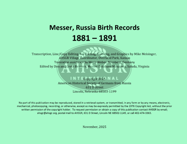 Transcription, Line/Copy Editing, Formatting, Indexing, and Graphics by Mike Meisinger, AHSGR Village Coordinator, Overland Park, Kansas