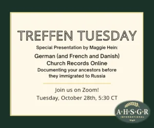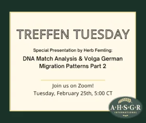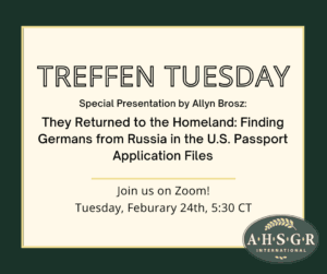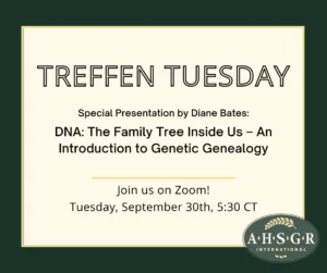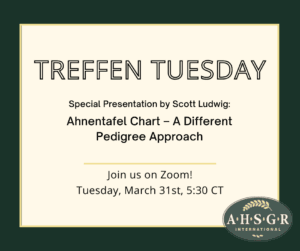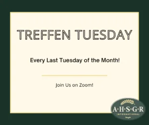 The presentations are held virtually via Zoom at 5:30PM central time. Treffen Tuesday is open to all, but pre-registration is required. Announcements of upcoming topics and pre-registration information are sent to AHSGR members and posted on ahsgr.org and social media (Facebook and Instagram).